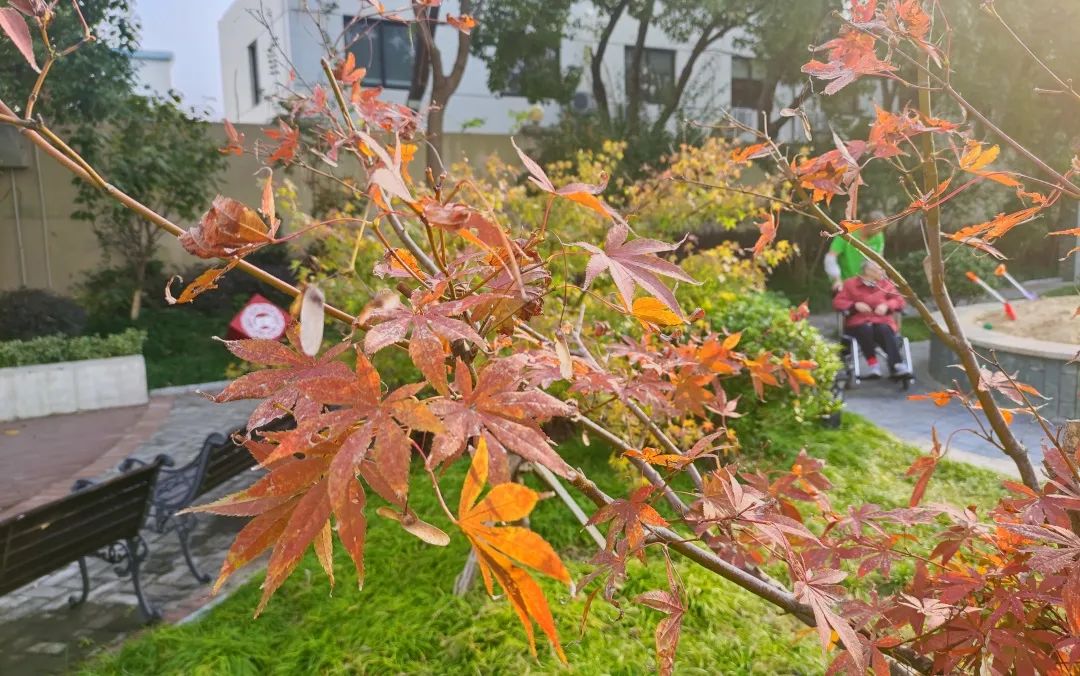 秋天,總是從落葉開始的,北橋老年福利院有著近2500平米的療愈樂園,樂園里栽種著上百種植物,一年四季綠植花香不斷,時值深秋,走在療愈花園里,身邊滿是五彩繽紛的樹葉,各種形狀、顏色、姿態(tài)不同的落葉,組成了一幅色彩斑斕的畫面。